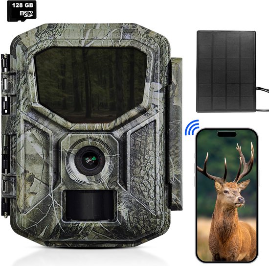 Siltcon® Wildcamera met Zonnepaneel & Oplaadbaar - 8K Ultra HD & 64MP - Wildcamera met Nachtzicht en WiFi - Bluetooth - Camera Buiten - Nachtcamera - No-Glow - 128GB SD - Tripod - 7800 mAh batterij - 2026 Model